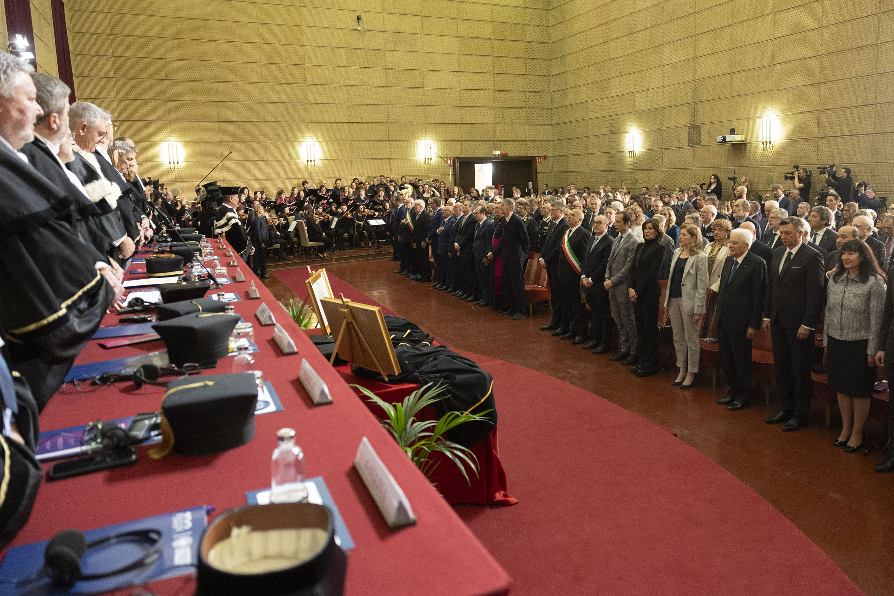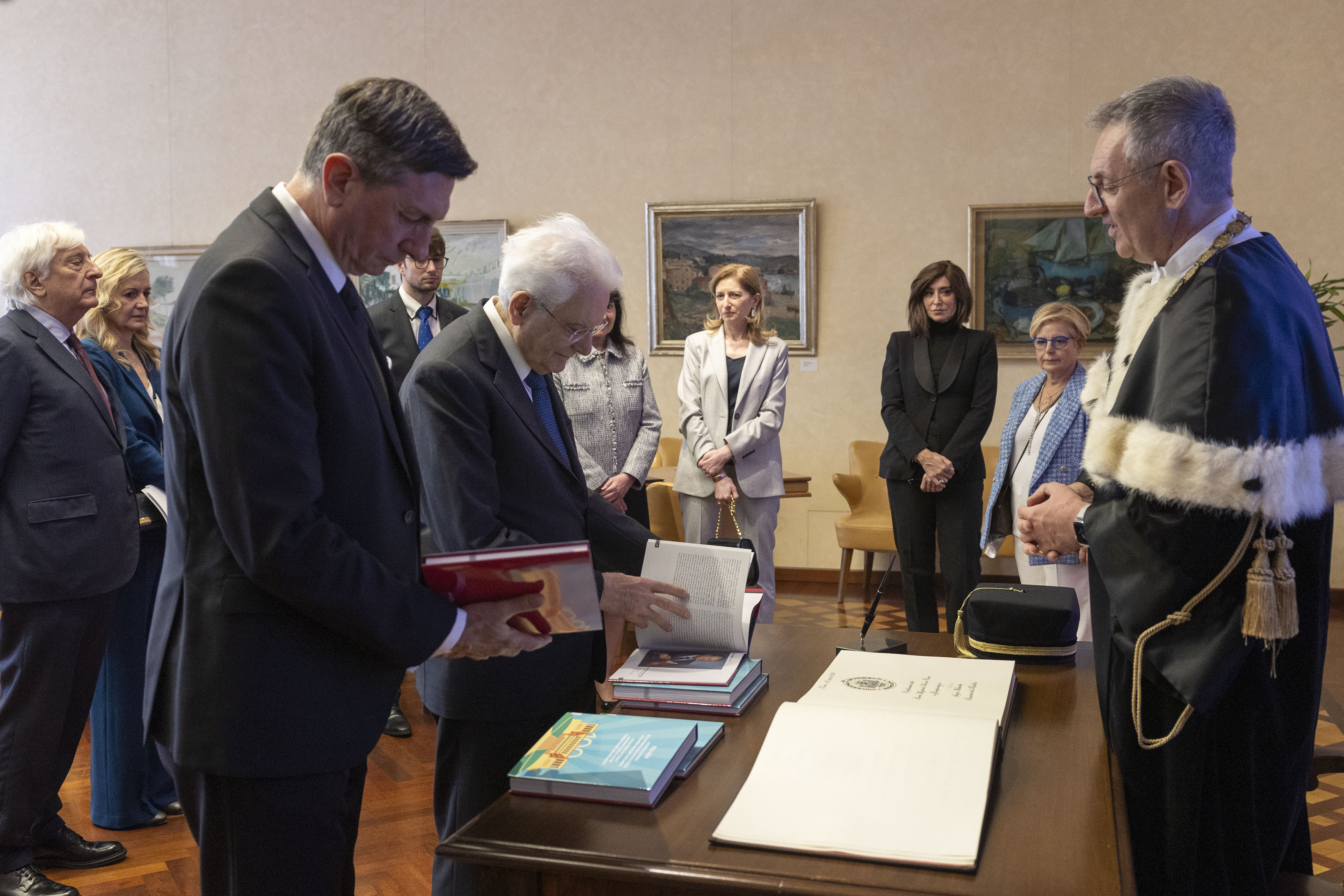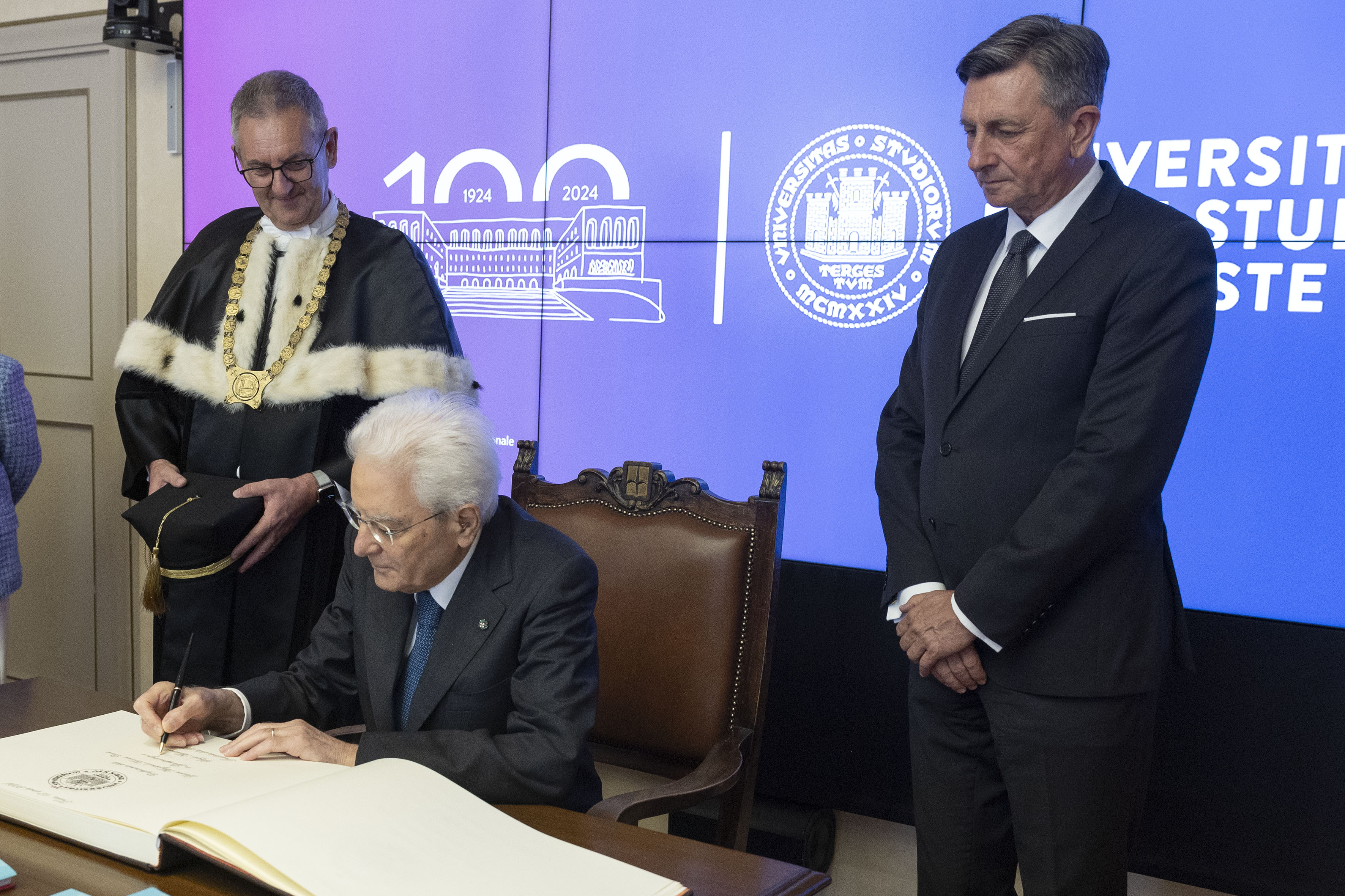 Trieste, 12/04/2024 (II mandato) Il Presidente della Repubblica Sergio Mattarella all’ Università degli Studi di Trieste,con Borut Pahor, Presidente emerito della Repubblica di Slovenia,in occasione della cerimonia di conferimento della Laurea magistrale Honoris causa in Giurisprudenza