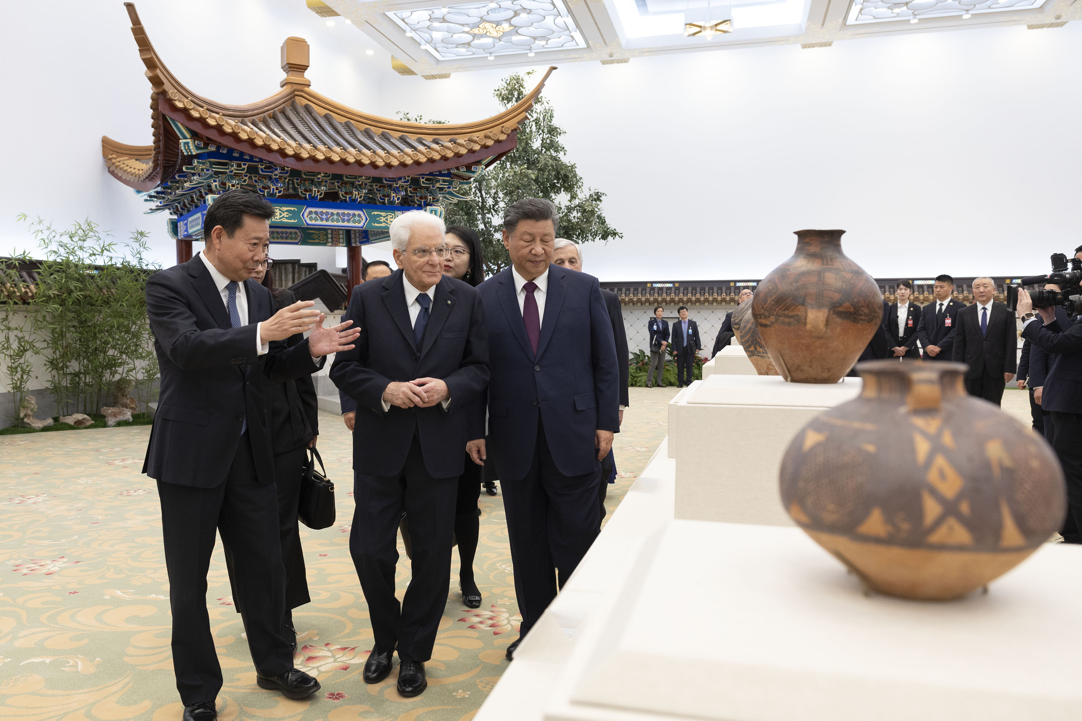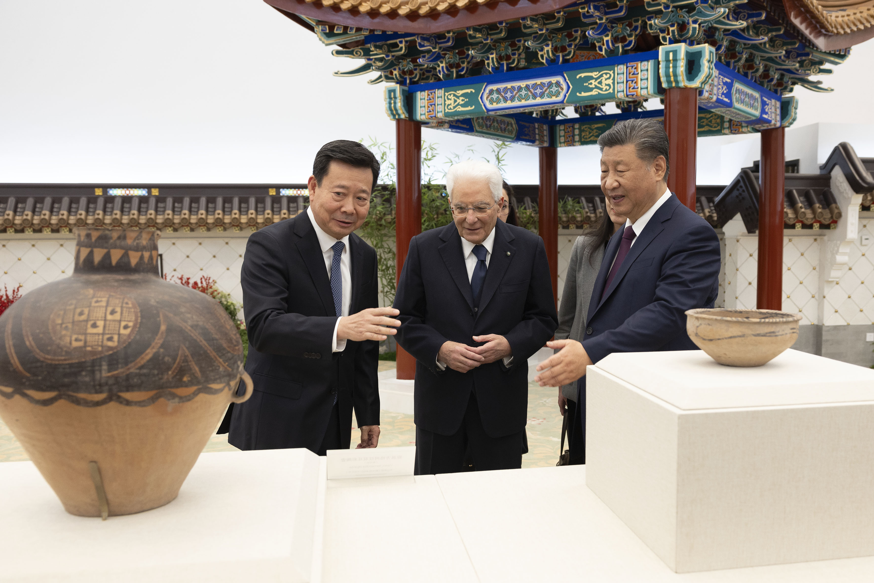 Pechino, 08/11/2024 (II mandato) Il Presidente della Repubblica, Sergio Mattarella con il Presidente della Repubblica Popolare Cinese, Xi Jinping, osservano alcuni reperti recuperati dai Carabinieri del Nucleo per la Tutela del Patrimonio Culturale e restituiti alla Repubblica Popolare Cinese