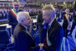 Bologna, 12/11/2025 (II mandato) Il Presidente della Repubblica Sergio Mattarella saluta Romano Prodi, alla cerimonia di apertura della 42^ Assemblea annuale ANCI – Associazione Nazionale Comuni Italiani – dal titolo “Insieme per il bene comune”