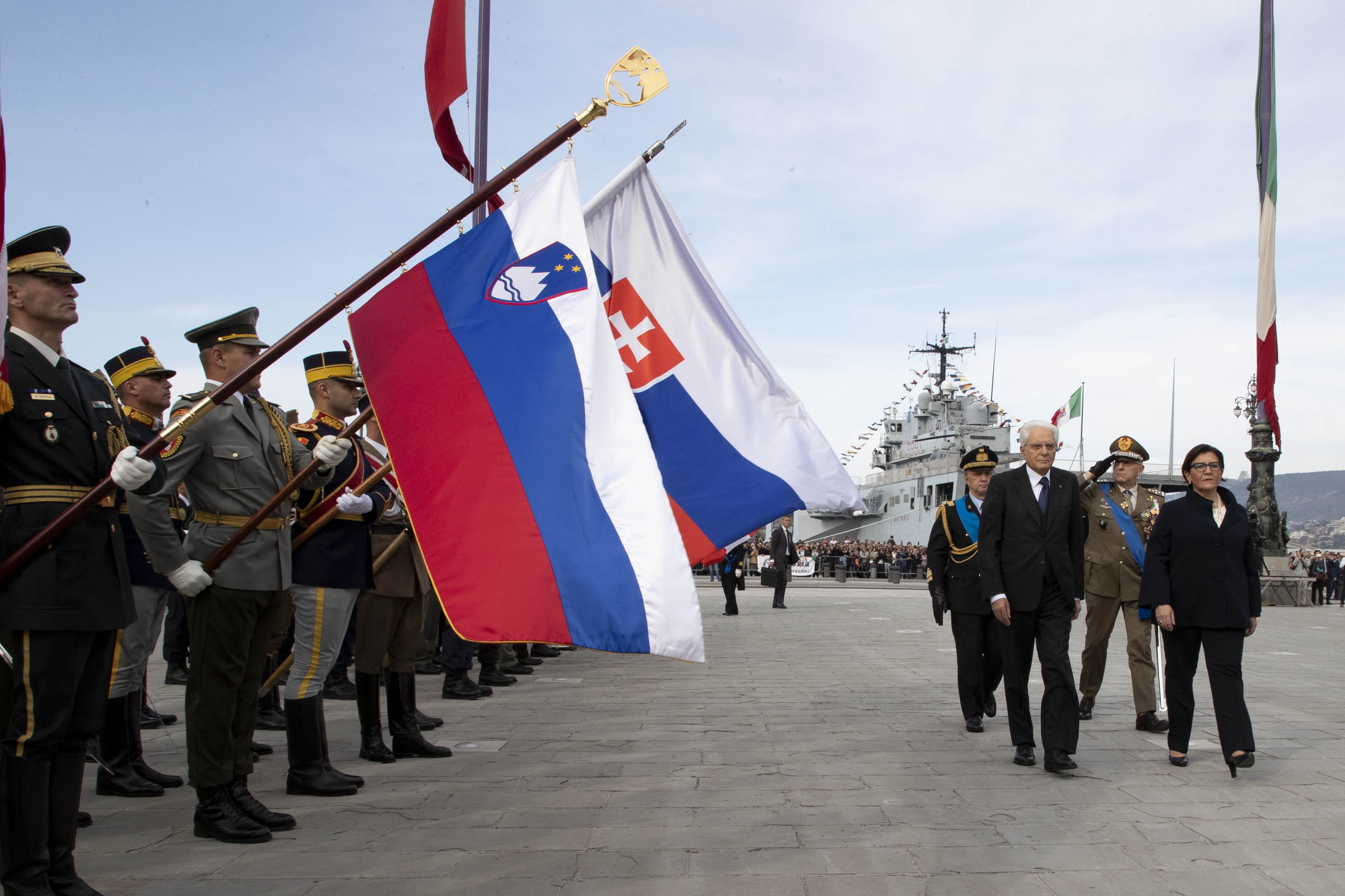 Trieste, 04/11/2018 (I mandato) Il Presidente Sergio Mattarella, nel Giorno dell'Unità Nazionale e Giornata delle Forze Armate, con il Ministro della Difesa in Piazza Unità d'Italia di Trieste, riceve gli onori militari.