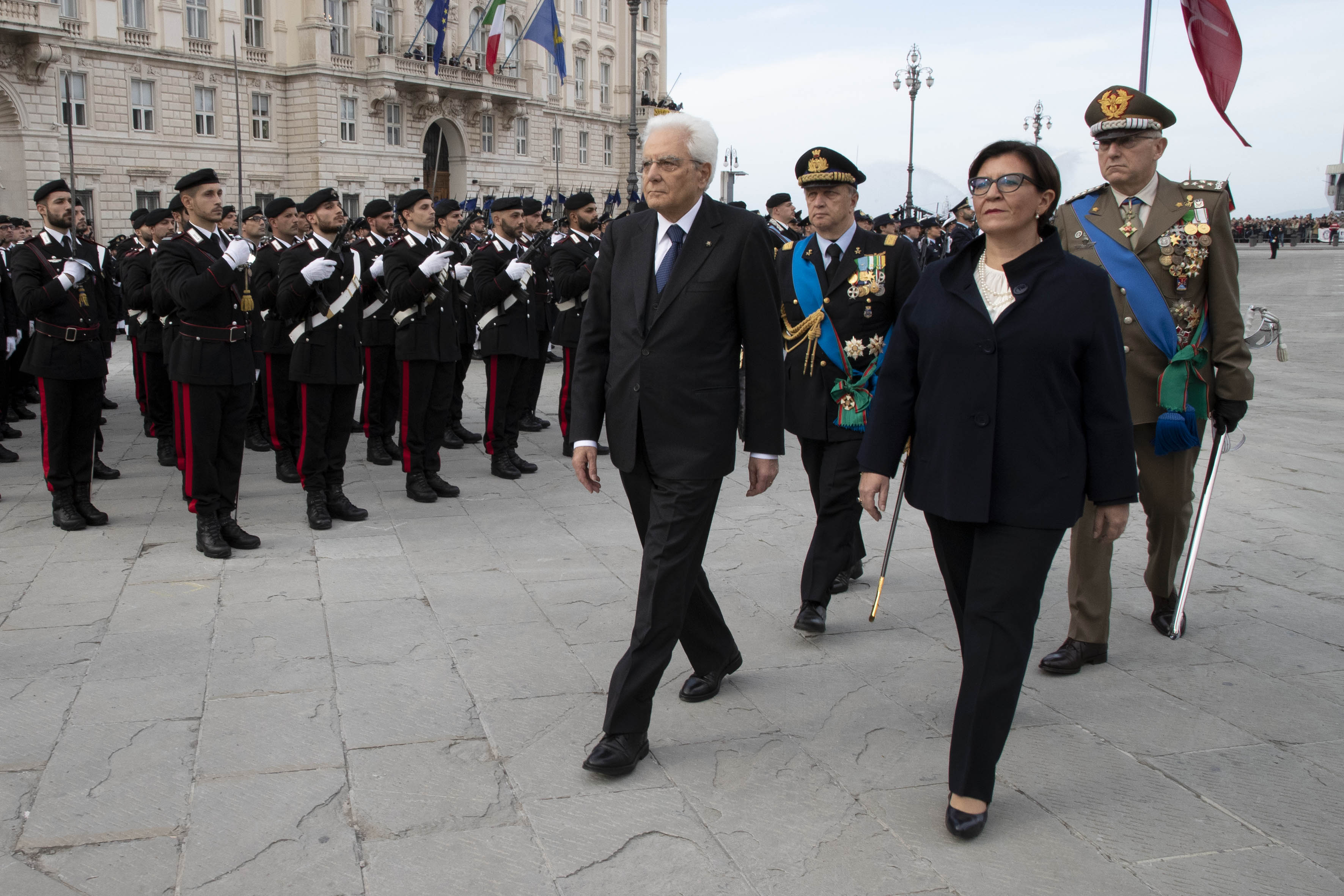 Trieste, 04/11/2018 (I mandato) Il Presidente Sergio Mattarella, nel Giorno dell'Unità Nazionale e Giornata delle Forze Armate, con il Ministro della Difesa Elisabetta Trenta, mentre passa in rassegna i reparti schierati.