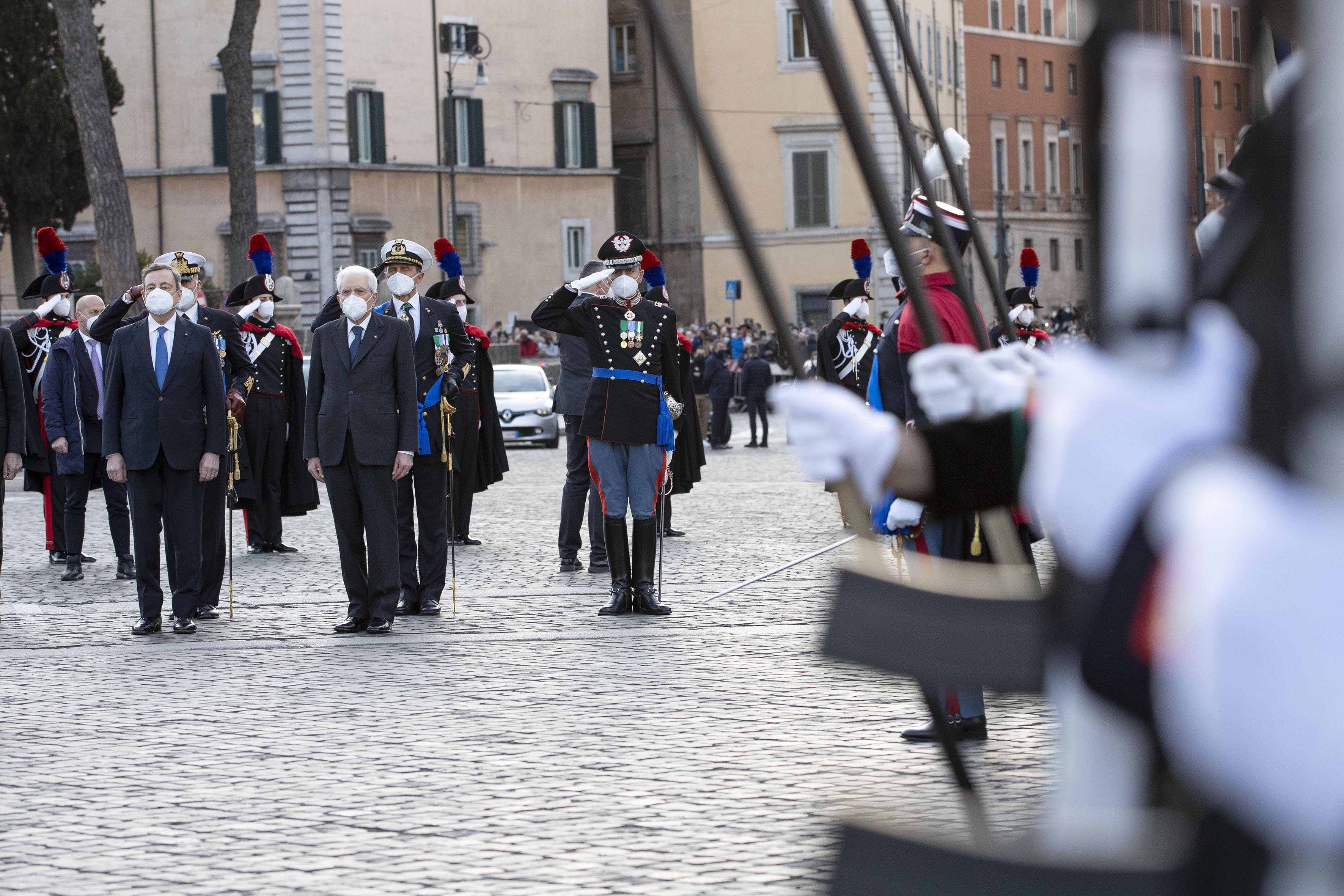 Palazzo del Quirinale, 03/02/2022 (II mandato) Il Presidente della Repubblica Sergio Mattarella, accompagnato dal Presidente del Consiglio Mario Draghi, passa in rassegna il reparto d'onore schierato con bandiera e banda