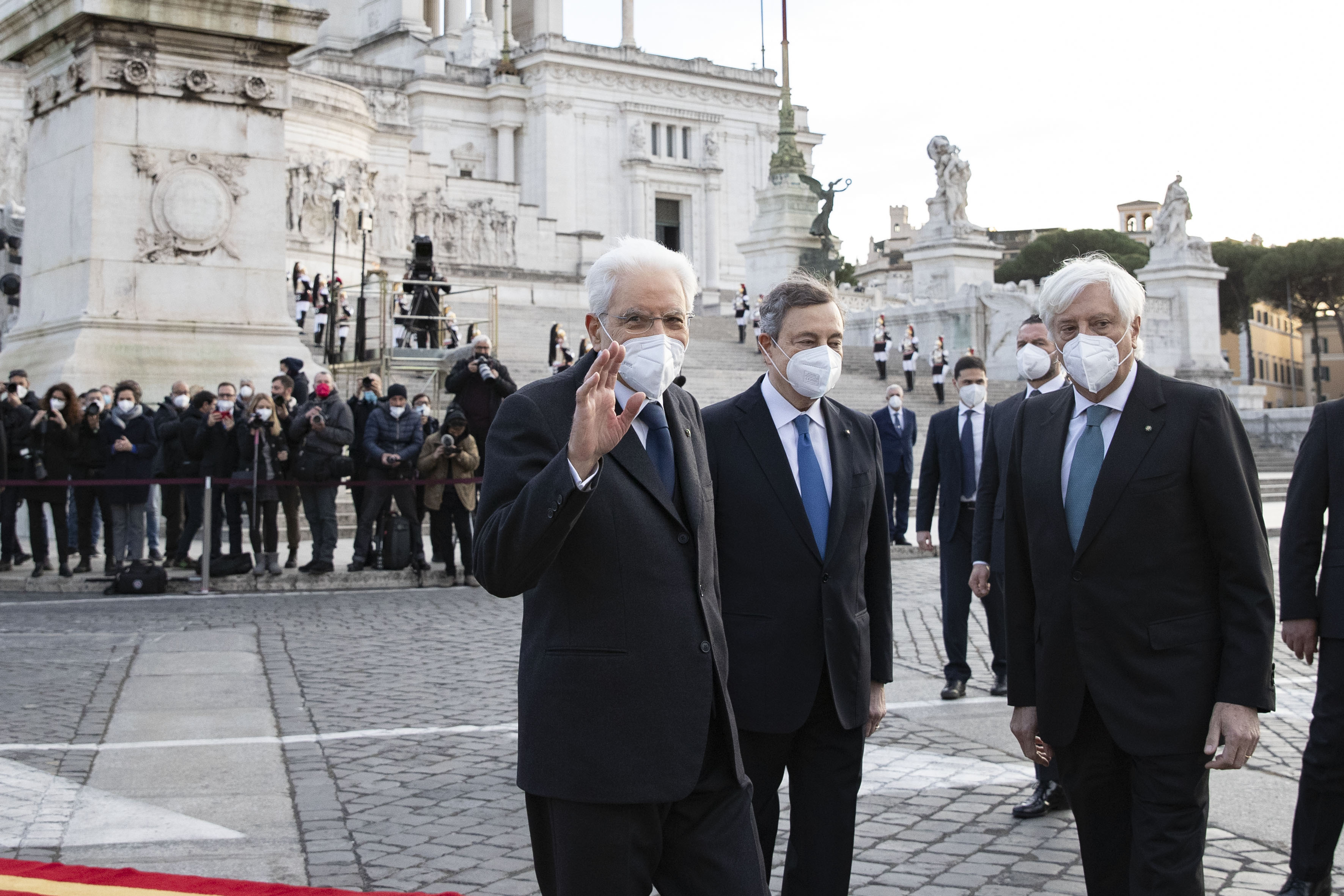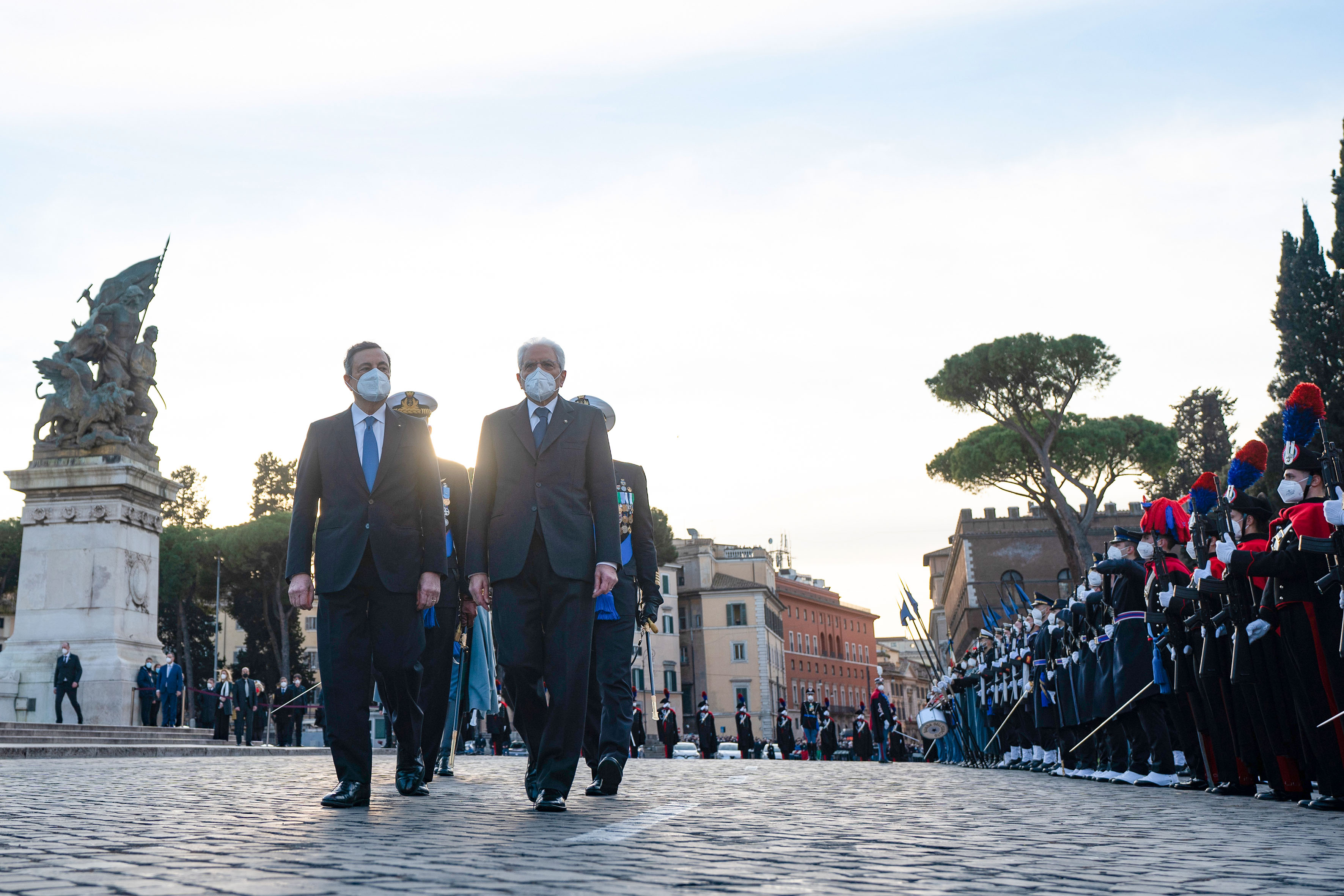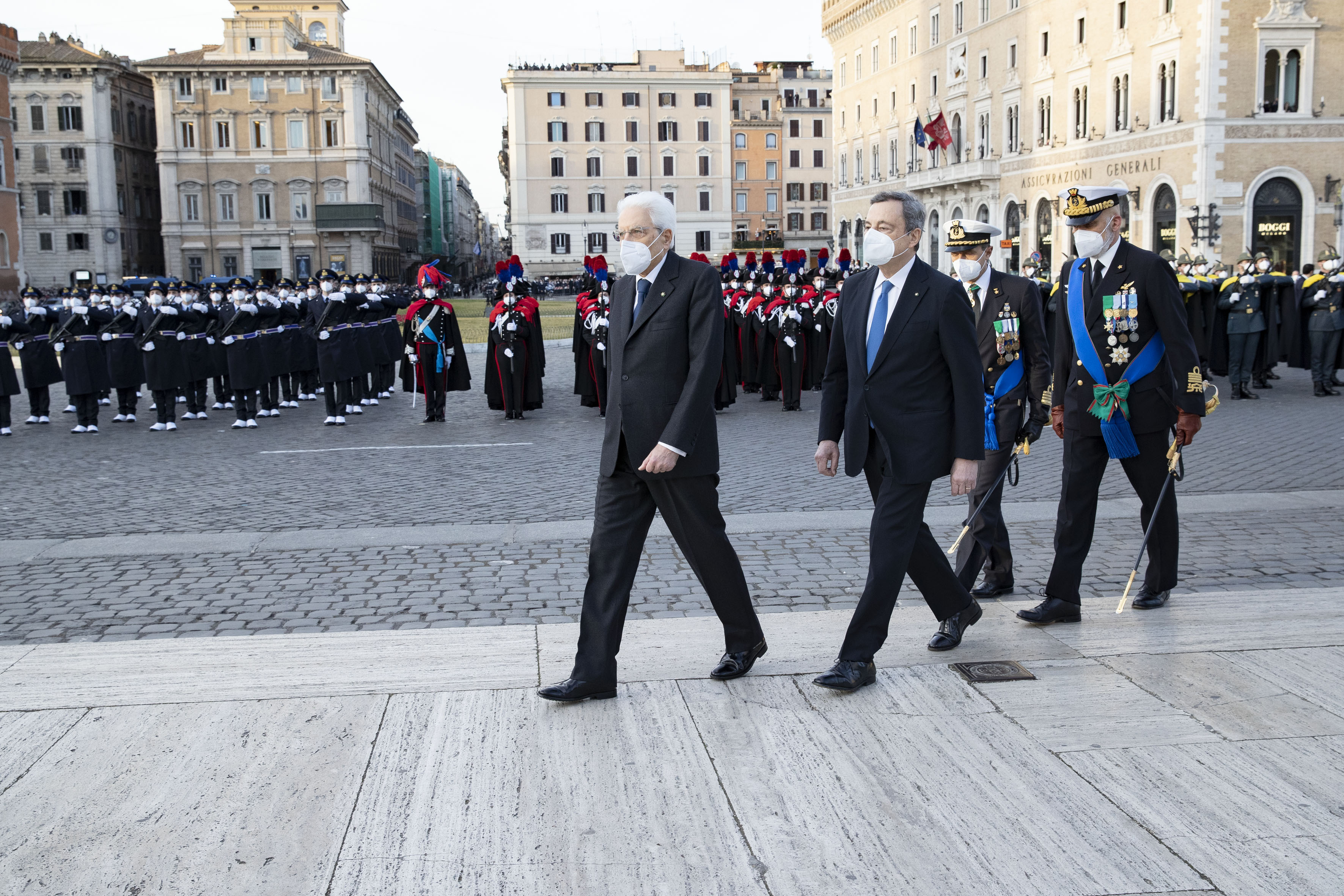 Roma, 03/02/2022 (II mandato) Il Presidente della Repubblica Sergio Mattarella con il Presidente del Consiglio Mario Draghi in occasione della deposizione di una corona d'alloro sulla Tomba del Milite Ignoto all'Altare della Patria