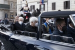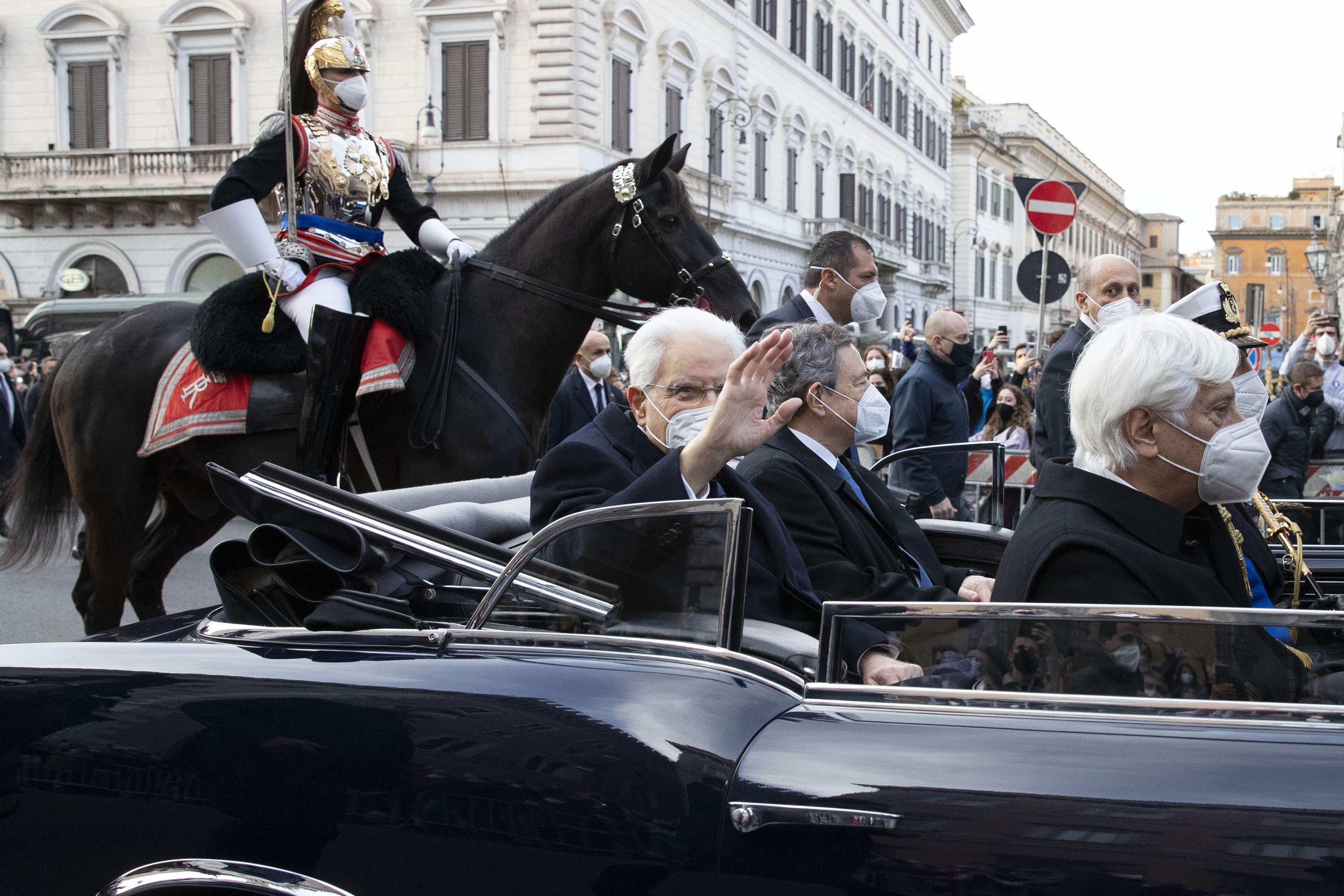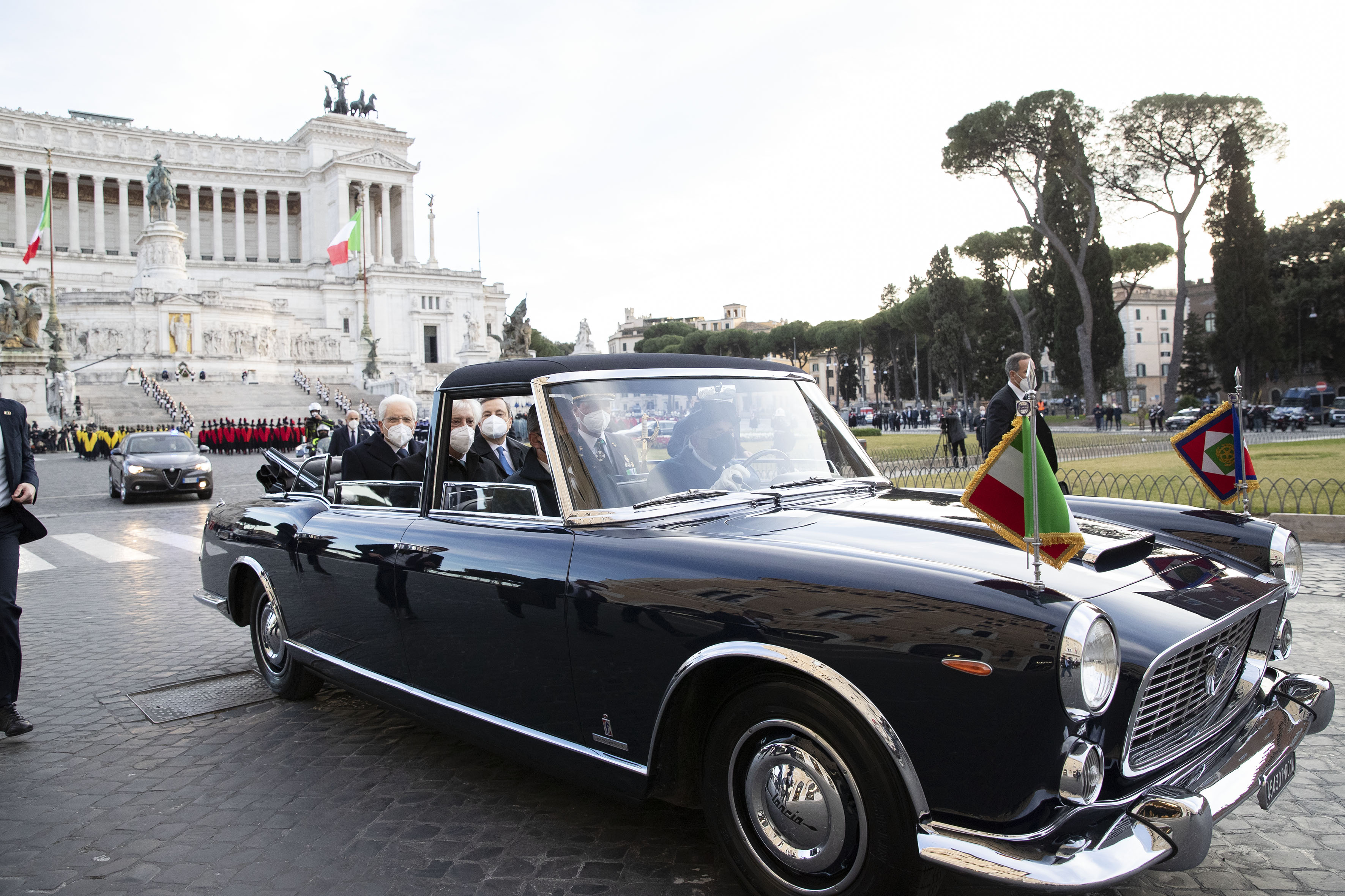 Roma, 03/02/2022 (II mandato) Il Presidente della Repubblica Sergio Mattarella con il Presidente del Consiglio Mario Draghi e il Segretario generale della Presidenza della Repubblica Ugo Zampetti a bordo della Lancia Flaminia 335